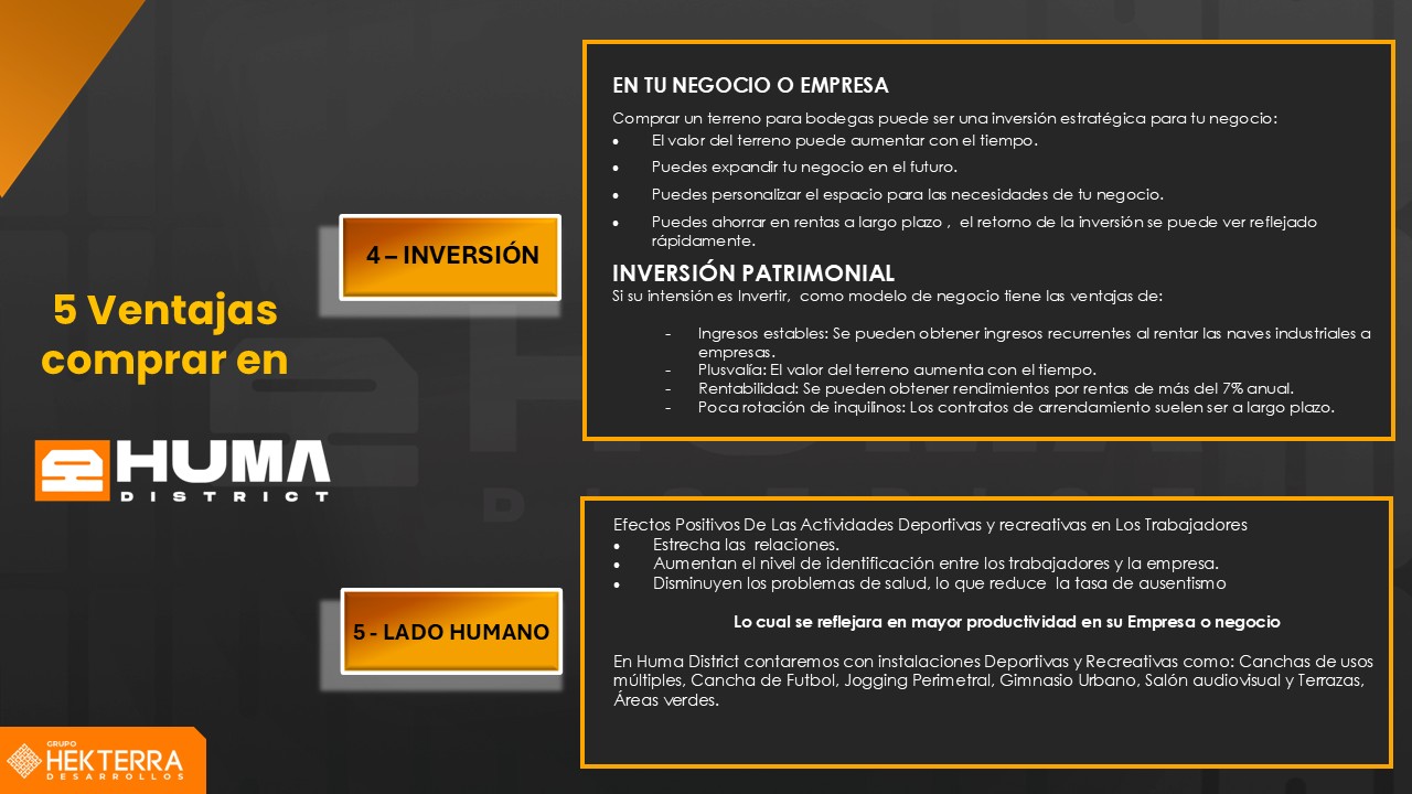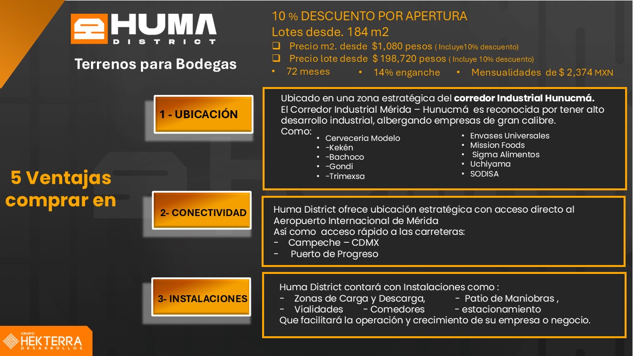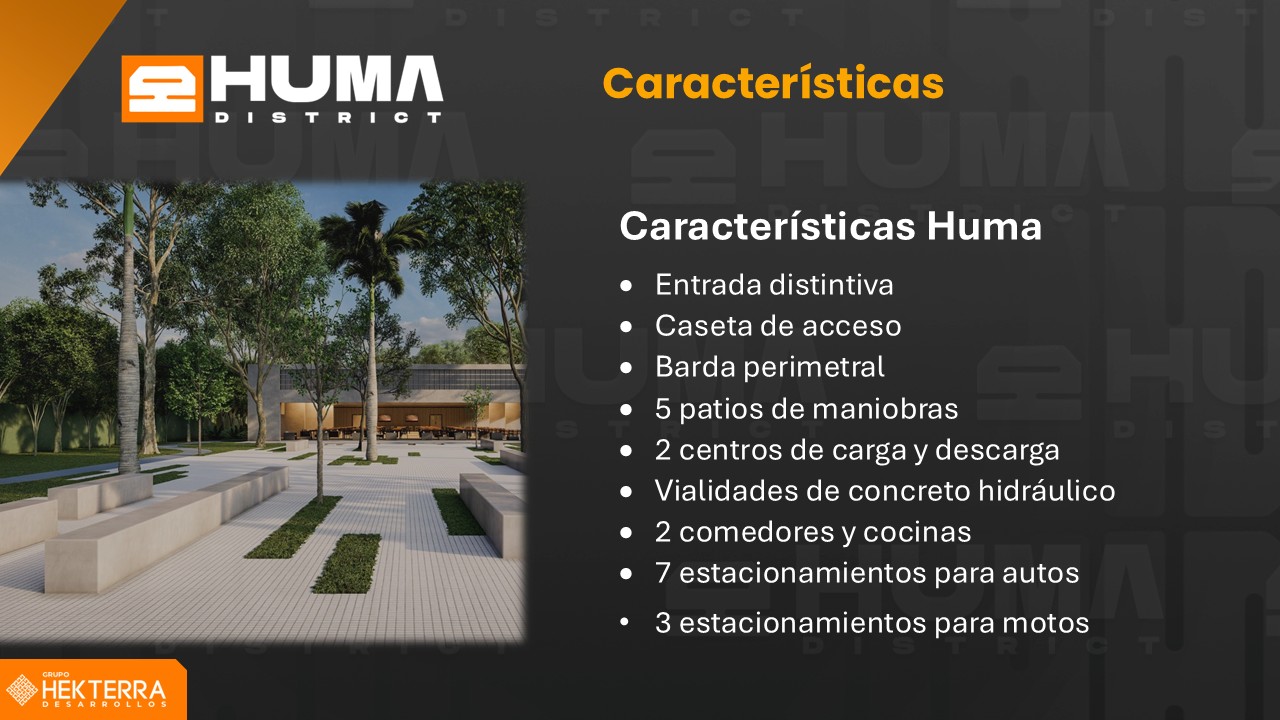 Con tres tipos de lotes diferentes, HUMA DISTRICT será el lugar perfecto para instalar bodegas, negocios, puntos de venta, oficinas, talleres, etcétera.